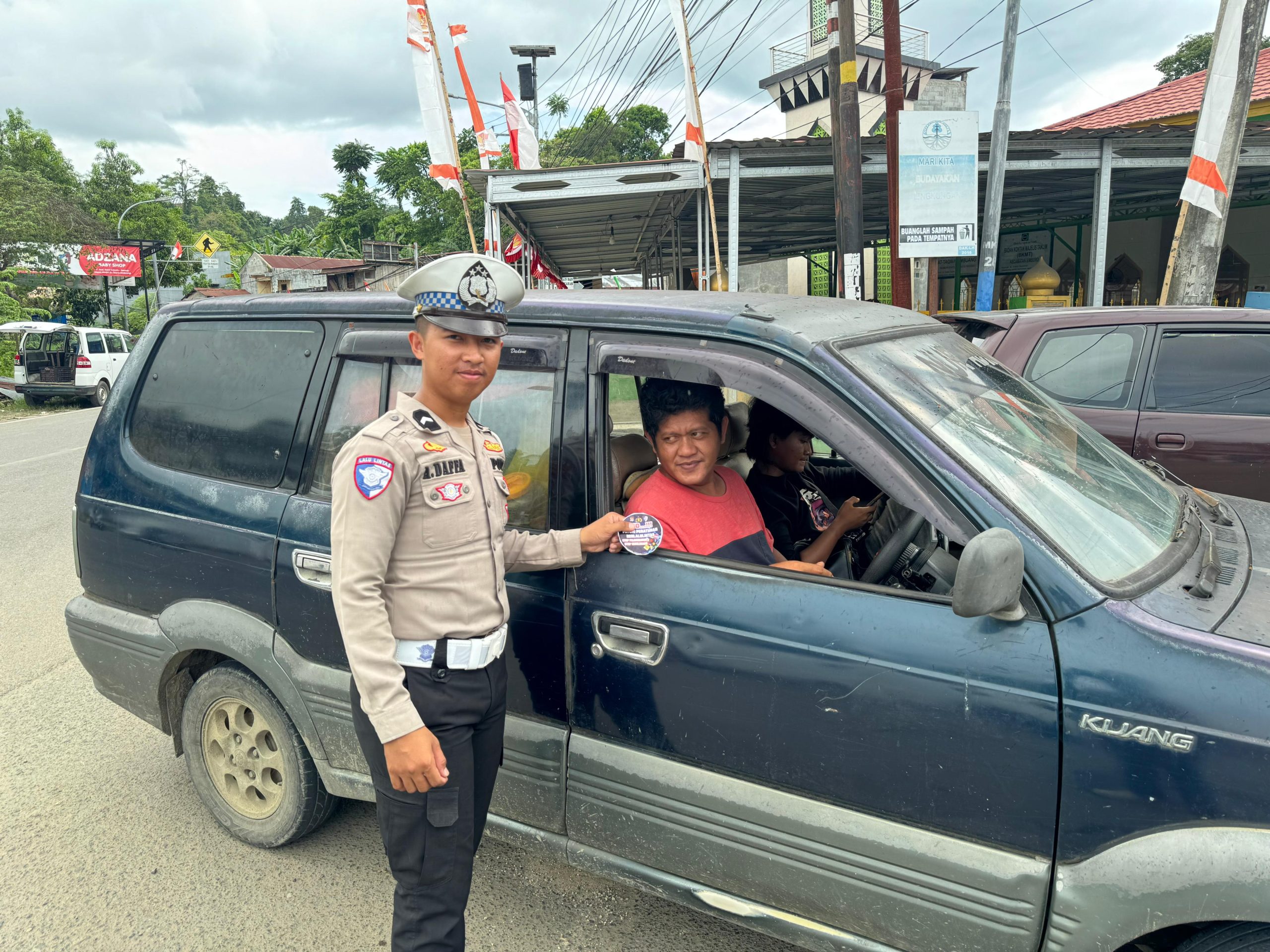 2. Pembagian Stiker Edukasi: Sebagai bentuk kampanye visual yang berkelanjutan, tim membagikan stiker Dikmas Lantas yang berisi pesan-pesan kunci tentang keselamatan berlalu lintas. Stiker ini diharapkan dapat menjadi pengingat visual bagi setiap pengendara untuk selalu mengutamakan keamanan saat berkendara.